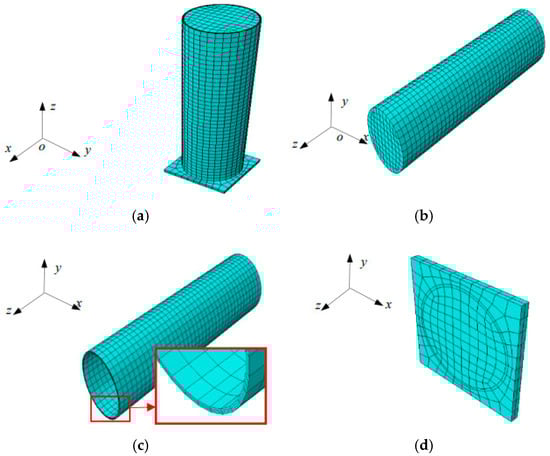 Specific meshing components: (a) General view; (b) Concrete core; (c) Steel tube; (d) Steel plate.