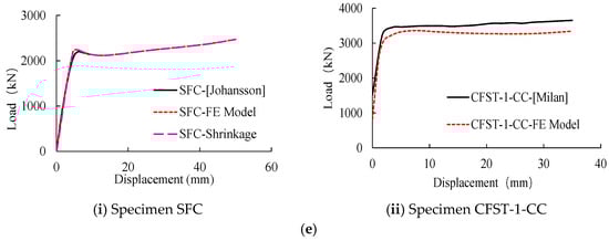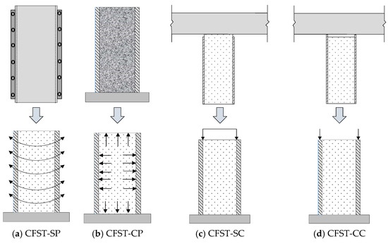 First, as shown in Figure 7a, the concrete of CFST-SP relied on the hoop stresses generated in the steel tube by the steel flanges and bolts to obtain an active radial preload (Figure 3b). CFST-SP is a new structure proposed by us. Its manufacturing process is not complicated. First, the steel plate is cut according to the design size and bent into the target shape, then assembled into a tube with high-strength bolts and filled with concrete, finally, the bolts are tightened to apply preload []. Figure 7b, however, showed a self-stressing concrete filled steel tube column, for which the concrete had an active three-way compressive preload during its outward expansion. The application of CFST-CP is relatively mature, and many scholars have also conducted relevant research on self-stressing concrete [,]. In this study, the temperature was applied directly to the steel tube of CFST-SP and the concrete of CFST-CP, with reliance on the temperature difference to achieve the active preloads; so, it was not necessary to simulate the flange and bolts of CFST-SP. Similarly, as shown in Figure 7c, for the passively preloaded column CFST-CC, only the concrete was subjected to pre-compression. Additionally, as shown in Figure 7d, for CFST-SC, only the steel tubes were subjected to pre-compression. These two models were derived from the engineering cases in Figure 1b,c.