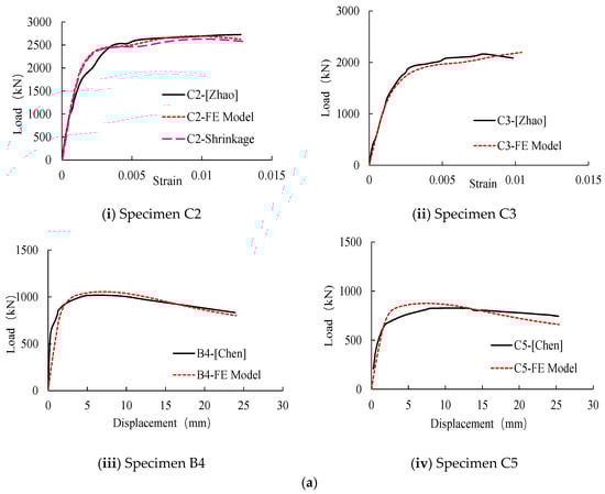 The finite element models for ordinary CFST columns and preloaded CFST columns under compression were validated by comparing the peak loads and the load-deformation curves determined by numerical calculations with the experimental results (Table 2 and Figure 8). As shown in Table 2, D, t, and l represent the diameter of the CFST, the thickness of the steel tub, and the full length of the specimen, respectively. fcu and fy are the cubic compressive strength of the concrete and the yield strength of the steel, respectively. Previous studies [,,,,,,] conducted ordinary CFST and experimental/numerical research on preloaded CFST in compression. In general, a column with L/D ≤ 4 is defined as a short column. The above specimens approximated short columns and were similar to the model analyzed in this study. Therefore, these specimens were suitable for validation to confirm the correctness of the model.