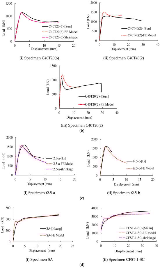 In Table 2, the peak loads determined from the finite element simulations (PFEM) are compared with the experimental/numerical peak loads (PLit). A mean value (PFEM/PLIT) of 0.999 and a coefficient of variation (CoV) of 0.094 were obtained. The load-deformation responses of some typical specimens are shown in Figure 8, which includes four representative models and the abovementioned ordinary CFSTs. As can be seen from the figure, the finite element simulation results are not completely consistent with the test results. This may be because the finite element simulation is carried out under ideal conditions, while in reality there may be problems such as plastic yielding of steel bars, shrinkage creep of concrete, interface contact, and initial defects of the specimen, which lead to deviations between the simulation results and the test results. However, in general, the initial stiffness values, peak loads, and post-limit behavior (dashed lines) obtained by the finite element simulation are basically consistent with the results of the literature and this study (solid lines). Therefore, we believe that the finite element model can provide accurate calculation results.