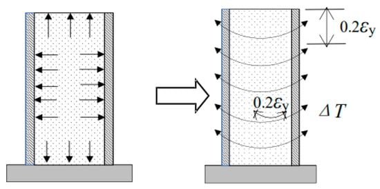 For CFST-CP, when the concrete expanded in three directions, the steel tube stretched in three directions, with the assumption of a hoop strain and longitudinal tensile strain of 0.2 εy for the steel tube (Figure 10). According to the above formulas, it was known that , and the steel tube and the concrete had a pre-contact pressure of 6.2 MPa. The coefficient of thermal expansion of the concrete was set to 0.8 × 10−5 °C−1, and the concrete warming of 63 °C was obtained.