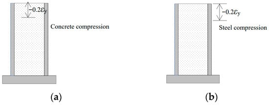 For CFST-CC and CFST-SC, the compressive strain of concrete and steel was 0.2 εsy, which meant that compressive preloads of 650 kN and 385 kN were applied to the concrete core (Figure 11a) and the steel tube (Figure 11b), respectively.