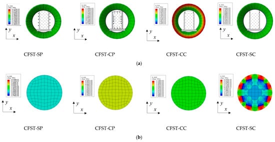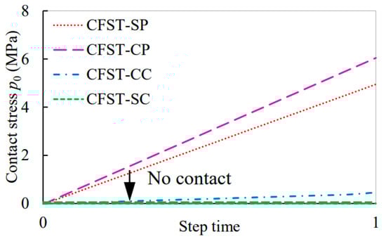 The longitudinal stress cloud for the steel tube and concrete in Step 1 is shown in Figure 14. Because of the assumed low preload, all of the specimens were in the elastic phase. In addition, Figure 15 depicts the contact stresses between the concrete and the steel tube. As can be seen from the figure, the contact stress in the actively preloaded specimens CFST-SP and CFST-CP was always higher than that in the passively preloaded specimens, particularly in CFST-SP, for which the contact stresses were almost zero due to insufficient restraint. In summary, while the preload-induced stresses might have been minor, they might have had a considerable impact on the performance of the preloaded specimens in Step 2.