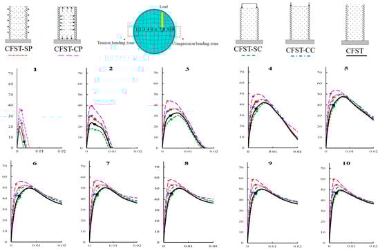 Although the active preload was not substantial for CFST-SP and CFST-CP, the concrete strength was enhanced, as seen in the graph. Furthermore, for CFST-CC, even though the pre-compression was passively applied, the concrete was subjected to an initial three-way compression, resulting in a slight increase in the concrete’s strength in the bending compression zone compared to the ordinary CFST. For CFST-SC, however, it can be seen from the diagram that the concrete initial stiffness in each CFST-SC unit was lower due to the absence of steel tubes working together, while the peak stresses in the concrete were also the lowest compared to the other specimens, even lower than those in the ordinary CFST. Finally, it is worth noting that the concrete in the CFST-SP compression bending zone reached its maximum at the same time that the specimen reached its peak load.