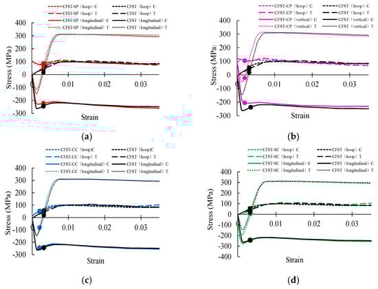 Stress versus strain of steel tube: (a) CFST-SP; (b) CFST-CP; (c) CFST-CC; (d) CFST-SC.