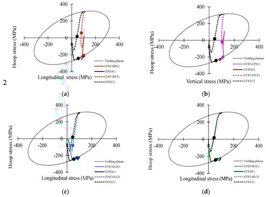 Von Mises yield curves: (a) CFST-SP; (b) CFST-CP; (c) CFST-CC; (d) CFST-SC.