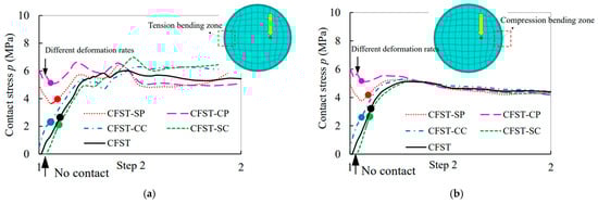 Figure 19 shows the development of contact stresses at the concrete-steel interface in the tensile and compressive bending zones in Step 2. First, it can be seen from the graphs that the stresses in both zones changed in a similar way. Second, the preloaded specimens, except for CFST-SC, started at Step 2 with non-zero interfacial stresses. As the load increased, the contact stresses in the specimens all increased. However, the stress curves of CFST-SP and CFST-CP suddenly drop and then rise. The reason for this phenomenon is that the Poisson’s ratio of steel is larger than that of concrete, so the deformation of the steel pipe is also larger than that of concrete in the early stage of service loading. However, because we applied preload, the steel pipe was already in close contact with the concrete (initial contact stress), and the deformation of the steel pipe and concrete after service loading was different, which made them less tightly combined at most, which was manifested as a decrease in contact stress, but they could still work together all the time (contact stress > 0). As the service loading increases, the two are closely combined again, and the contact stress increases.