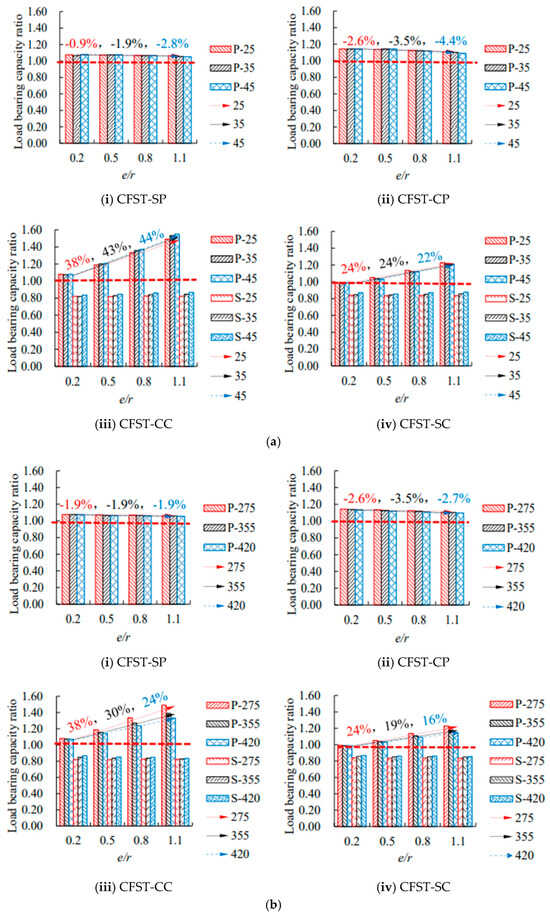 As can be seen from the graph, for CFST-SP and CFST-CP, the peak load ratios of the specimen were always greater than 1.0 when the eccentric ratio increased, which meant that the load-bearing capacities of CFST-SP and CFST-CP were always higher than that of the ordinary CFST, regardless of the influences of the eccentric ratio, concrete strength, steel yield strength, and steel thickness. Additionally, the ratio values of the specimens were uniform and that of CFST-CP was slightly higher than that of CFST-SP. For CFST-CC, the peak load ratio increased significantly when the eccentricity increased, even beyond 2.0. When the concrete strength increased, the rate of change of the peak load ratio was almost the same, but for the steel tube strength and thickness, the rate of change decreased with the increase in grade, especially for the steel tube thickness. This was because the lower the steel tube strength and the steel tube thickness of the ordinary CFST were, the lower the confinement effect was. When the eccentric ratio increased, its compressive load-bearing capacity was very small. Due to the pre-three-way compressive effect, the load-bearing capacity of CFST-CC increased, and its peak load ratio with the ordinary CFST was more prominent. Finally, for CFST-SC, regardless of the grade of the influencing factor, the peak load ratio increased with the increase in the eccentric ratio, and when the eccentric ratio was greater than or equal to 0.5, the peak load ratio was greater than 1.0, with a maximum of approximately 1.20. The peak load ratios of the concrete strength, steel tube strength, and steel tube thickness followed approximately the same trend as the grade increased. However, in general, the rate of change of the peak load ratio was lower for CFST-SC than for CFST-CC. It can also be found from Figure 20 that although the peak load ratios of CFST-SC and CFST-CC were almost always greater than 1.0, i.e., the peak load was higher than that of the ordinary CFST, the maximal service loads were always lower than that of the ordinary CFST. Additionally, when the pre-strain was 0.2 εy, the maximal service load was always approximately 90% of the peak load of the ordinary CFST.