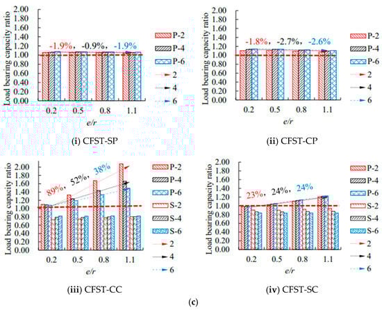 Figure 20a–c reflect the effects of the concrete compressive strength, steel yield strength, and steel thickness on the compressive load-bearing capacity of the preloaded CFST columns, respectively. The horizontal coordinates in the figure represent the eccentricity of the specimen, and the vertical coordinates represent the load-bearing capacity ratios. P represents the peak load ratio, and S represents the maximal service load ratio, i.e., the ratio of the peak load of the preloaded CFST to the load-bearing capacity of the ordinary CFST and the ratio of the maximal service load of the preloaded CFST to the load-bearing capacity of the ordinary CFST.