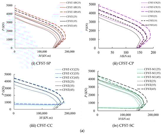(3) The effects of the concrete strength, steel tube strength, and thickness on the M-P envelope curves of the specimens were also prominent. Regardless of the influencing parameters, the M-P curves for CFST-SP and CFST-CP were always significantly more convex than those of the ordinary CFST, and the M-P curve of CFST-SC was less convex than that of the ordinary CFST, but the difference between the curves for CFST-CC and the ordinary CFST was not significant. Additionally, a1 and a2 were always positive for CFST-SP and CFST-CP, indicating that the maximum compressive and flexural capacities of both CFST-SP and CFST-CP were significantly improved, especially for CFST-CP. Moreover, a1 and a2 were mostly positive for CFST-CC, indicating that smaller passive preloads for the concrete were not always detrimental to the load-carrying capacity. For CFST- SC, both a1 and a2 were negative. It is also clear that except for CFST-CP, changing the parameter grade had little effect on a1. However, the effect of changing the parameter grade on a2 for CFST-CC and CFST-SC was significant. For CFST-CC, a2 decreased with the increasing concrete strength and even became negative, but a2 increased with the increasing steel tube strength and thickness. For CFST-SC, the pattern of variation of a2 with the influence of concrete strength and steel strength was similar to that of CFST-CC.