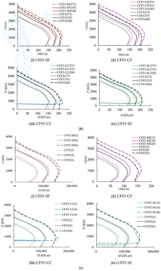 Effect of various parameters on M-P interaction diagram: (a) Effect of concrete strength; (b) Effect of steel strength; (c) Effect of steel thickness.