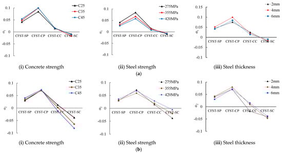 Figure 22a shows the effects of the concrete strength, steel tube strength, and steel thickness on a1 for different specimens. It can be seen from the figure that except for CFST-CP, changing the parameter grades had very little effect on a1. The variation of a2 shown in Figure 22b was more complex compared to that of a1. For CFST-SP and CFST-CP, the effect of the parameter grade on a2 was small, but for CFST-SC and CFST-CC, the effect of the parameter grade on a2 was more evident. For CFST-CC, a2 decreased with the increasing concrete strength and even became negative. This phenomenon indicated that the greater the concrete strength was, the greater the preload was, and according to the principle of static equilibrium, the maximum bending moment became smaller instead and was even lower than that of the ordinary CFST. However, a2 increased with the increasing steel strength and thickness, which indicated that with the increase of the confinement coefficient related to the steel strength and thickness, the CFST-CC concrete strength in the compression bending zone was improved and the maximum bending moment was enhanced. Finally, for CFST-SC, the effect of the preload on the maximum bending moment was negative for any change in the parameter grade, with concrete strength and steel tube strength being the most prominent, and the pattern of change was consistent with that of CFST-CC.