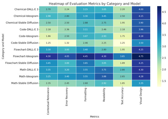 The heat map in Figure 2 provides a detailed visualization of the performance of the AI model on multiple evaluation metrics, highlighting both strengths and areas of improvement. In the chemical category, Ideogram demonstrates relatively better performance in metrics such as formatting (3.30) and visual design (4.15). However, all models face significant challenges with text accuracy, as seen in scores of 2.20 for DALL-E 3, 2.50 for Ideogram, and a low 1.95 for Stable Diffusion, indicating substantial difficulties in maintaining precision and coherence in this domain. The code category shows an overall weaker performance across models, with Ideogram scoring highest in formatting (3.07), while text accuracy remains particularly low for Stable Diffusion (1.25) and Ideogram (1.75), underscoring systemic struggles in generating reliable and accurate code-related text. In the flowchart category, Ideogram excels, achieving the highest scores in visual design (4.75) and readability (4.30), signifying its ability to produce polished, legible, and visually appealing outputs. Stable Diffusion also performs reasonably well in flowcharts, though it falls short of Ideogram’s benchmarks. For the math category, DALL-E 3 and Ideogram show strength in formatting (3.55) and readability (above 3.75), while Stable Diffusion continues to trail, scoring particularly low in text accuracy (1.85) and visual design (3.35). Overall, the results highlight Ideogram’s strong performance in flowcharts but also underscore persistent struggles with the accuracy of the text, particularly in the chemical and code categories.