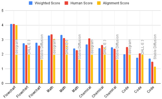 We compared performance scores (alignment and weighted scores) from GPT-4 and human evaluators across categories such as flow charts, mathematics, chemistry, and code to assess evaluator alignment. As shown in Figure 3, the model aligns closely with human evaluators in categories such as flow charts and mathematics, where differences are minimal. However, in more complex tasks such as chemistry and code, it provides stricter evaluations, particularly regarding structural clarity and alignment. These findings suggest that, while GPT-4 is a reliable evaluator of structured content, fine-tuning is needed to better match human perceptions in a specialized domain.