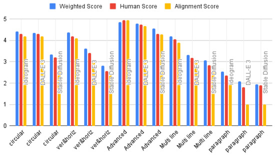 The weighted score ranges from 1 to 5, reflecting the degree of alignment between the generated image and the given caption. A score of 5 represents excellent alignment, with flawless accuracy and clarity in content, style, and formatting. A score of 4 indicates strong performance with minor inconsistencies or inaccuracies, such as slightly off labels or formatting. A score of 3 suggests a good attempt in which the overall concept is captured but notable inaccuracies or missing elements affect clarity and effectiveness. A score of 2 reflects a partial match, marred by significant errors or omissions that compromise utility. Finally, a score of 1 signifies minimal alignment, where most critical elements are incorrect or missing, rendering the image largely ineffective. So for the evaluation, the weighted score reflects GPT-4’s aggregated evaluation of overall performance, while the human evaluator score captures the perception of output quality by 5 expert human evaluators. The alignment score measures how well the generated outputs align with the given prompts, providing a focused evaluation of prompt adherence.