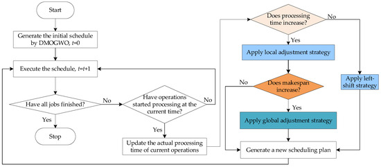 The flowchart of the heuristic scheduling method is summarized in Figure 1. Based on the predicted processing time outlined in Section 4, a robust initial scheduling plan is generated using DMOGWO considering three optimization objectives. Then, during the implementation of the schedule, the actual processing time of each operation is only determined when the operation is about to begin, bringing about a deviation in the estimated processing time. Consequently, a scheduling decision should be made at that time to make adjustments as the reaction to the change in processing time. In this study, a hybrid heuristic scheduling method that combines three adjustment strategies is proposed according to different scenarios with the aim of ensuring both the scheduling efficiency and robustness in uncertain production environments. The relevant description is as follows: