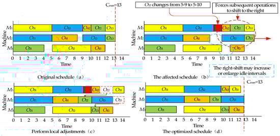 To explain this strategy, an example as shown in Figure 2 is provided. With regard to the original scheduling in Figure 2a, when the processing time of an operation increases, it may delay the start time of its subsequent operations within the same job or those that are processed on the same machine, resulting in the right-shift phenomenon as shown in Figure 2b. This can lead to two issues: (1) the emergence of idle intervals in areas where none existed in the original schedule, and (2) the expansion of existing idle intervals. To address these issues, an insertion-based local adjustment strategy is proposed, and the specific steps are described as follows:
