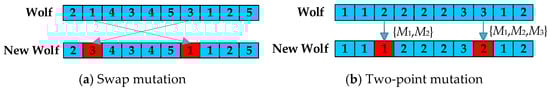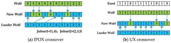 The methods for solving the DFJSP can be mainly divided into exact algorithms, heuristic algorithms, and metaheuristic algorithms. The exact methods are not able to find feasible solutions for comparatively complex models in acceptable timeframes. Moreover, although heuristic algorithms are easy to implement, it is difficult to obtain high-quality solutions. In contrast, metaheuristic algorithms have been widely used since they can maintain a balance between the solution quality and operational efficiency. As a relatively new member of this group of methods, the grey wolf algorithm (GWO) is inspired by the social hierarchy and predatory behavior of grey wolves; it has the advantages of simplicity, flexibility, and ease of implementation. So far, GWOs have been applied to a variety of scheduling problems, such as the job shop scheduling problem [7], the flexible job shop scheduling problem [8,9,10], the flow job shop scheduling problem [11], and the distributed flexible job shop scheduling problem [12,13]. However, to the best of our knowledge, there is no reported work about using the GWO to solve the DDFJSP-VPT.