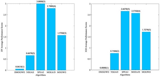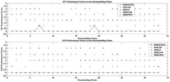 As shown in Figure 9, DMOGWO consistently maintains the lowest performance scores across the majority of rescheduling points, whereas NSGA-II, SPEA2, MOEA/D, and MOGWO exhibit more fluctuating and generally higher scores, highlighting their instability in dynamic scheduling problems. Figure 10 further confirms this observation, in that the lowest average performance scores in both HV and IGD were achieved by DMOGWO, ranking first and significantly outperforming the other algorithms. These results are consistent with the conclusions drawn from the previous experiments.