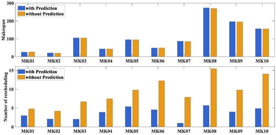 In Section 4, the prediction is based on the assumption that processing times satisfy certain constraints with a given probability. As the probability threshold increases, the system’s ability to absorb uncertainty improves, but the scheduling performance may decrease. Therefore, selecting the probability threshold involves a trade-off between uncertainty absorption and scheduling performance. Following [47], a threshold of 0.85 is chosen, and the effectiveness of the proposed prediction strategy is verified through experiments. We compare the initialization scheduling schemes generated with and without the prediction strategy for all test cases. Each scheme is run 20 times, and the average completion time and number of rescheduling events are compared. The results are shown in Figure 11.