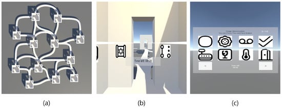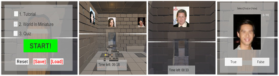 The original memory palace technique is widely accessible and can be learned quickly. However, effectively utilizing it for storing and recalling large volumes of information often requires structured training, making its full potential challenging to access for untrained users. Researchers have explored whether the use of computer graphics technology could enable the general public to create virtual memory palaces, visually arranging the information they want to remember in such a way that it yields memory enhancement effects comparable to those of traditional memory palaces. Harman was an early pioneer in proposing the virtualization of memory palaces using computers [4]. Fassbender and Heiden attempted to create virtual memory palaces as a substitute for traditional ones [16], and Legge et al. demonstrated that virtual memory palaces could provide memory enhancement effects on par with those of traditional memory palaces [17]. Similarly, Reggente et al. showed that utilizing the method of loci within virtual reality environments improves memory performance by explicitly binding objects to spatial contexts, thereby enhancing subsequent memory recall [12,18]. An interesting example of a virtual memory palace is the work of Das et al., who proposed using a 3D-rendered virtual maze (the memory palace) on a mobile phone, with the path taken through the maze serving as a password [19]. They confirmed that this approach was easier to remember than the traditional 9-dot password system. These early virtual memory palaces were typically implemented based on images rendered with 3D graphics on desktop monitors. However, numerous studies have shown that immersive environments experienced with virtual reality (VR) headsets are more effective for memory retention than desktop environments [5].