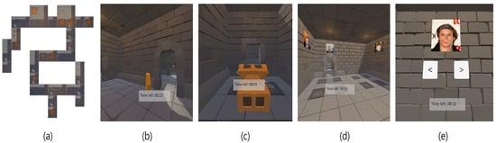 Gamified virtual memory palace: (a) An aerial view of the entire memory palace. (b) A collectable coin found in a room. (c) A box for keeping coins. (d) Target images on the walls for the user to memorize. (e) Test screen for checking whether a certain image has been included in the memory palace or not. (The faces of the characters have been blurred to prevent infringement of portrait rights).