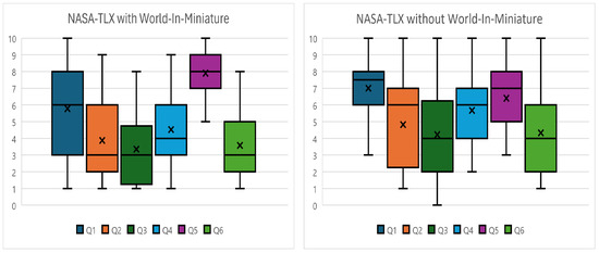 The NASA-TLX allows participants to subjectively evaluate various types of load that may occur while performing tasks in a given environment. There are six evaluation items, each corresponding to the following questions. In the questions listed below, “the task given through this system” refers to exploring the given virtual space to memorize objects. The questionnaire uses a 0 (very low) to 10 (very high) scale, with lower scores indicating less effort or lower task load. Notably, for Q5 (Performance), higher scores are considered better, reflecting successful task completion, as shown in Table 1.