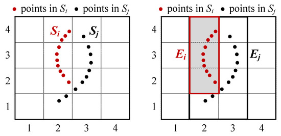We give an example to demonstrate the above definitions shown in Figure 2. A spatial space is divided into grids, i.e., . There are two spatial datasets and distributed in G, and the corresponding grid density distributions and can be obtained by calculating the density and quantity of grids in the minimum covered grid collections and , respectively.
