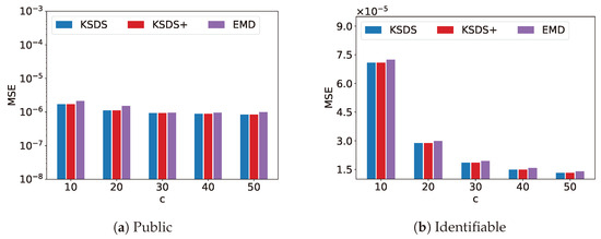 To calculate the MSE, we first perform k-means clustering on the points in the exemplar dataset to determine the cluster centers. Subsequently, we compute the average distance from each point in the search results to its nearest cluster center. The MSE quantifies the average distance between the location points of the search results and those of the exemplar dataset, with a smaller MSE indicating closer proximity between the two sets of points. Since is solely used to accelerate the search and does not affect the search results, experiments evaluating search effectiveness do not include the parameter a. Figure 5, Figure 6, Figure 7, Figure 8 and Figure 9 illustrate the MSE of KSDS, KSDS+ and EMD as the parameters c, , k, n and u vary.