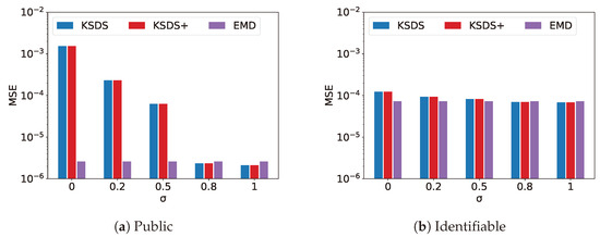 Figure 6 compares MSE versus for the KSDS, KSDS+ and EMD algorithms. The parameter serves as the similarity regulator in the similarity-calculation process. As the parameter decreases, the similarity calculation increasingly emphasizes quantitative similarity. Consequently, certain points outside the intersection of MCGs may contribute to a reduction in the average distance between location points within the datasets, thereby decreasing the overall MSE.