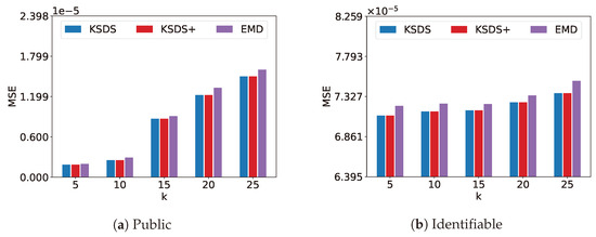 Figure 7 compares MSE versus k for the KSDS, KSDS+ and EMD algorithms. The parameter k denotes the number of requested spatial datasets. As k increases, the MSE of KSDS, KSDS+ and EMD algorithms also increase. This is because a larger k results in the inclusion of more datasets with lower similarity in the search results, thereby leading to higher MSE values.