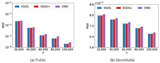 Figure 8 compares MSE versus n for the KSDS, KSDS+ and EMD algorithms. The parameter n denotes the number of spatial datasets. As n increases, the MSE values of algorithm KSDS, KSDS+ and EMD all decrease. This occurs because a larger number of datasets in the data repository enhances the likelihood of finding more similar results, thereby decreasing the MSE.