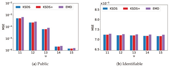 Figure 9 compares MSE versus u for the KSDS, KSDS+ and EMD algorithms. The parameter u denotes the space-dividing threshold used in the grid partitioning process. The parameter u directly determines the number of grids within each dataset’s MCG, thereby affecting the computational time overhead for each similarity calculation. As illustrated in the figure, a larger u results in increased search time cost.