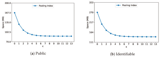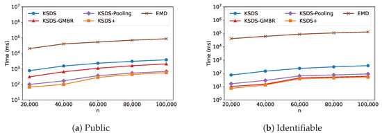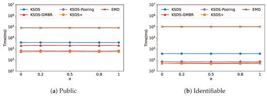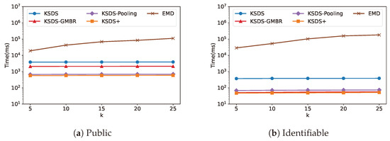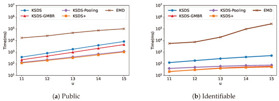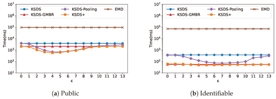 The relationship between search time cost and is illustrated in Figure 14. It can be observed that the search efficiency of KSDS and KSDS-GMBR remains unchanged as varies. This is because only influences KSDS-Pooling and KSDS+, thereby affecting their search efficiency. As changes, the search efficiency of KSDS-Pooling and KSDS+ exhibits a decreasing trend followed by an increase. From the results, we identify the optimal values of that minimize the search time overhead for the two data repositories, Public and Identifiable, which are and , respectively.
