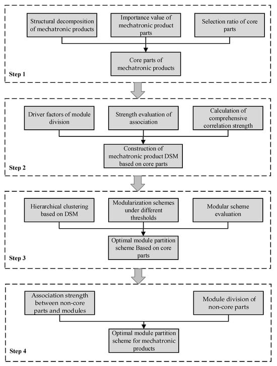 The research framework we used was divided into four steps, as shown in Figure 1. These were (1) mechatronic product core part screening based on expert scoring; (2) mechatronic product structure modeling with core parts; (3) mechatronic product module division by hierarchical clustering; and (4) non-core part module division based on association analysis.