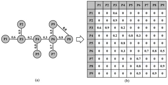 Based on the evaluation value of the comprehensive correlation strength between the mechatronic product parts, a DSM model of the mechatronic product can be constructed. Figure 2a shows the structural model of a virtual product, and the corresponding DSM model is shown in Figure 2b. In Figure 2b, the names of product parts correspond to the first row and the first column of cells of the DSM, while the values in the other cells represent the comprehensive correlation strength of the corresponding two parts.