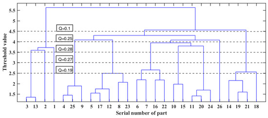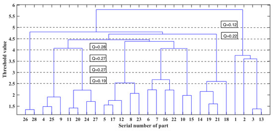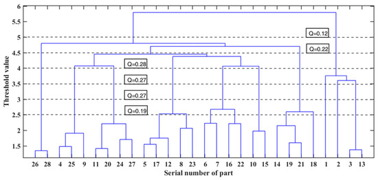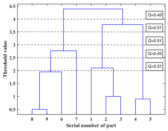 The tree diagram in Figure 9 shows the clustering results of the core components of the electric bicycle, where the horizontal coordinate is the serial number of the part and the vertical coordinate is the threshold value. To obtain a more useful module division scheme, the threshold values are 2.5, 3, 3.5, 4, and 4.5, and the corresponding modularity index Q value and module division scheme are shown in Figure 9 and Table 4, respectively.