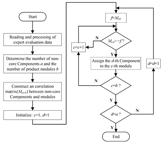 The quantity of data that must be processed during the process of module division of non-core parts is very large. Therefore, we compiled a module division program of non-core parts using MATLAB software (2016a) to reduce the workload of module division. Figure 6 shows a flow chart of the module division of non-core parts of mechatronic products.