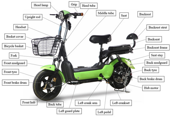 An electric bicycle (shown in Figure 7) consists of approximately 100 main parts. Obviously, it is very difficult to establish the DSM structure model of the product based on these 100 main parts, so the size of the product DSM model can be reduced by screening the core parts. Five product engineers involved in the design of electric bicycles evaluated the functional importance and structural complexity of the parts according to the scoring standards shown in Table 1. Through the weighted sum of the scores given by the designers, the comprehensive importance values and ranking of electric bicycle parts were obtained, as shown in Table 3. When the threshold was 60, the top 28 parts were selected as the core parts of the electric bicycle.
