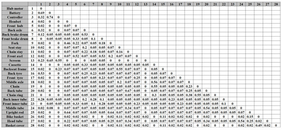 After the selection threshold of the core parts was set to 60, 28 core components of electric bicycles were screened out, thus determining the size of the DSM specifications. Then, the values of the different correlation strengths between the core parts were evaluated based on the evaluation criteria shown in Table 2. Finally, based on the weights of five correlations, where structure correlation, function correlation, flow correlation, life span correlation, and recovery method correlation are 0.25, 0.3, 0.25, 0.1, and 0.1, the comprehensive correlation strength value was calculated, and the DSM model of an electric bicycle was obtained, as shown in Figure 8. In addition, the weights were obtained by a mathematical weighting calculation on the basis of the questionnaire survey conducted among five senior engineers in this professional field. The weight value is not fixed, and enterprises can adjust it according to the characteristics and design needs of their products. For example, if an enterprise wanted to reduce the environmental impact of product obsolescence, the weight of the recovery attribute could be increased.