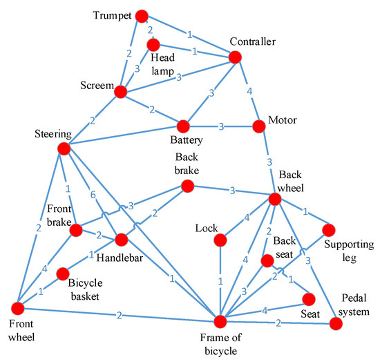The community identification algorithm of complex weighted networks is often used to divide complex product modules, and researchers who adopt this method use the pre-modular method to reduce the difficulty of complex product modeling. The complex weighted network model of an electric bicycle is shown in Figure 11, and the modularization scheme is obtained through the modified GN algorithm [42]. To facilitate this comparative study, the modular scheme with ten modules was selected as the optimal one, as shown in Table 6.