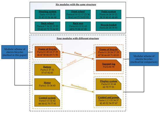 Among the ten modules, the structure of the steering system module, front wheel module, pedal system module, back wheel module, back seat module, and bicycle basket module is the same in the two modular schemes. The differences between the two modular schemes are shown in Figure 12, and the rationality of the modules is analyzed as follows: