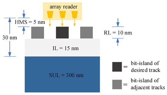 Notably, research in [14,15,16] suggested that utilizing staggered island arrays, instead of rectangular island arrays, can enhance the bit-error rate (BER) performance at the same AD. Staggered island arrays have been proven to be effective in mitigating the impact of ITI caused by the presence of adjacent tracks. Moreover, an array-reader magnetic recording (ARMR) is a signal processing technique that has been implemented in BPMR systems [17,18,19]. ARMR involves the simultaneous processing of signals from multiple readers, which allows for robust information recovery in ultrahigh AD BPMR systems when compared with a single-reader system [20]. The multiple readers yield multiple readback signals that correlate with the interference, thus improving the detection process. Furthermore, dual-reader ARMR has been utilized to evaluate the skew-induced variation in cross-track separation for increasing the recording performance [21].