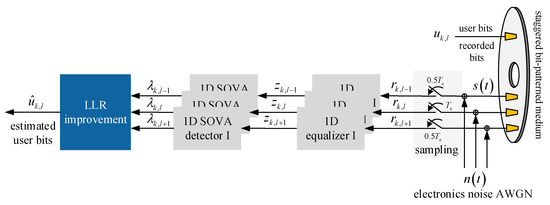 The one-dimensional (1D) partial-response maximum-likelihood (PRML) technique is an essential and comprehensive approach that characterizes the signal’s partial response, adapts to changing signal conditions through adaptive equalization, utilizes the soft-output Viterbi algorithm (SOVA) for efficient detection, and can incorporate error correction coding to enhance data reliability. It is an essential technique that plays a vital role in ensuring accurate and reliable data retrieval in magnetic recording. In addition, improving the soft information or log-likelihood ratio (LLR) generated from the SOVA detector is also proposed to enhance the overall system performance. For instance, the encoding criteria of a modulation encoder are utilized to improve the LLRs before sending them to the decoders [22,23]. Specifically, the encoding condition is used as the criterion for flipping the obtained LLRs: as a result, the LLRs can be significantly enhanced, improving system performance.