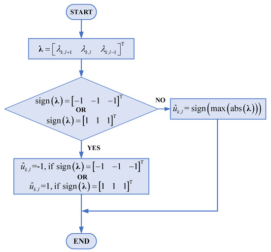 For the MSI finding technique, we start by considering mutual data in the form of three soft-information values or LLRs produced by 1D SOVA detectors in a 3 × 1 column vector, i.e., , similar to HIF. Here, is a transpose operator. Since λ is a real number vector, when we examine max(abs(λ)) in Figure 7, we can determine the highest LLR among the three considered LLRs, where the max(x) function returns the element with the highest value from the vector x. Consequently, the sign of the highest LLR will be defined to be an estimated user bit, . To better understand the MSI process, we can refer to the flowchart displayed in Figure 7, which can be described as follows.