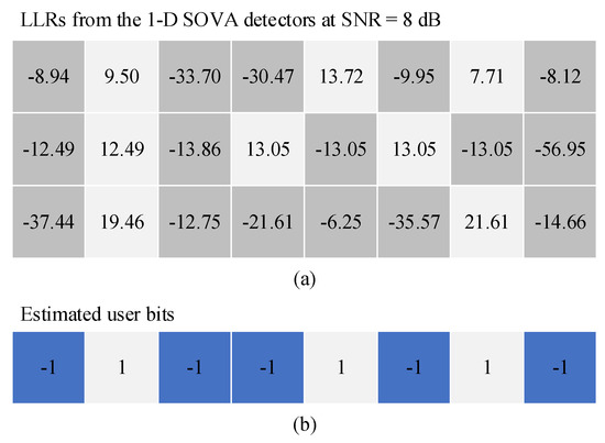 An example of how the BSD technique operates is demonstrated in Figure 9. First, the LLRs produced from the 1D SOVA detectors are arranged in a 3 × 1 column vector, i.e., , as in Figure 9a. Then, the elements in each column are summed according to (7) to obtain the improved LLRs, as shown in Figure 9b. Finally, the estimated user bits are obtained by passing the improved LLRs through a threshold detector, giving the results shown in Figure 9c.