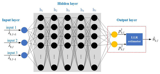Figure 10 illustrates the proposed MLP architecture. The idea is to employ one single network to process all LLR mutual data sequences obtained from the 1D SOVA detectors. As depicted in Figure 10, the MLP takes the LLRs obtained from the 1D SOVA detectors as inputs to improve prediction robustness [24] and generates the corresponding user bit sequence as an output. This MLP consists of neurons arranged in stacked, fully connected layers. Each neuron calculates its output and passes the data to the next layer. Additionally, this MLP has seven layers, i.e., one input layer, five fully connected hidden layers, and one output layer.