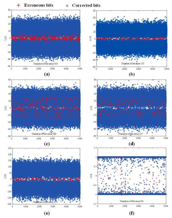 In this study, six systems were evaluated: System I (1D conventional and 2D conventional systems, without LLR enhancement), System II (HIF), System III (MSI), System IV (BSD), and System V (MLP). Our evaluation was based on an AD of 3.0 Tb/in2. Figure 11 illustrates the LLR distributions of the five systems under the same conditions, with SNR = 12 dB, and the media noise was neglected. In Figure 11, the blue dots represent correct LLRs, while the red cross symbols denote erroneous LLRs. The x-axis represents the bit number, set at 50,000 bits, whereas the y-axis displays the LLR values generated from the 1D SOVA detectors, except for the 2D conventional system in the LLR values generated by the 2D SOVA detectors [36]. Figure 11a–f correspond to Systems I to V, respectively. Upon observing Figure 11, it is evident that the conventional system exhibited higher erroneous LLRs than the other systems. Conversely, System V demonstrated superior LLR performance, with only 94 erroneous bits, as shown in Figure 11f.