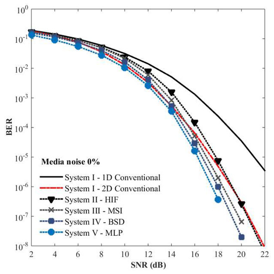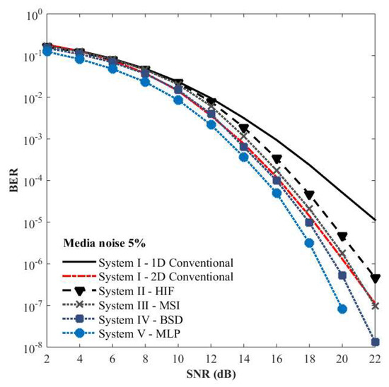 Furthermore, we also evaluated the proposed systems under severe media noise conditions (i.e., 10% media noise), as illustrated in Figure 14. The results reveal that the severity of media noise affects all systems, significantly degrading their BER performance. However, all proposed systems maintained superior BER performance compared to the 1D conventional system. Specifically, at BER = 10−4, Systems II, III, IV, and V achieved gains of 2.4, 3.9, 4.5, and 5.0 dB, respectively, over the 1D conventional system. The 2D conventional system gains around 2.5 dB over the 1D conventional system at BER = 10−4, which means that it not only deals with the ITI effect but also copes with the media noise effectively. However, the proposed MLP technique provides the best BER performance. This demonstrates the robustness of our proposed systems even under severe media noise conditions.