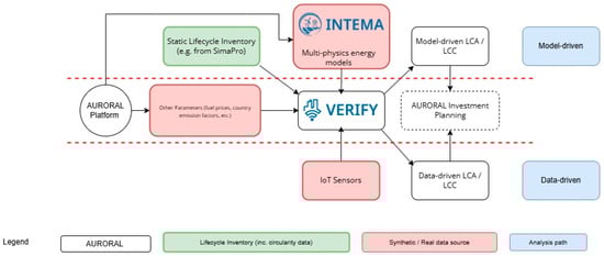 In the context of project AURORAL, VERIFY was integrated into the broader AURORAL platform to support the LCA and LCC analyses for the project’s building renovation projects. Figure 1 presents the architecture of the overall platform. It should be noted that, while in this case, the AURORAL platform was used as a data source, any source provisioning either real-time or historical data of hourly granularity can be used for VERIFY’s analyses.